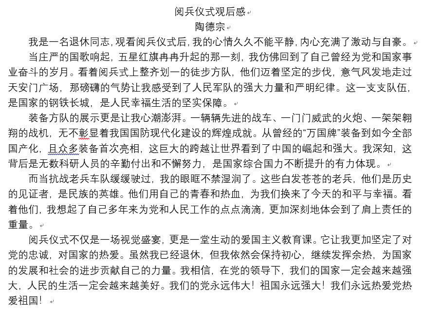 观看完大会后,离退休教职工们纷纷为祖国点赞。他们表示,中国人民抗日战争的胜利,是全体中华儿女浴血奋战的结果。如今,祖国日益繁荣昌盛,作为离退休教职工,他们将继续发挥余热,传承和弘扬伟大的抗战精神。